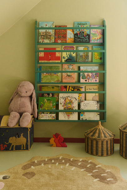 A the large book shelf is placed in the corner, keeping all of Alban and Noam's books within reach. This corner is one of the boys' favourite places to play, especially Noam enjoys to play here.