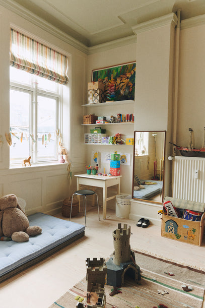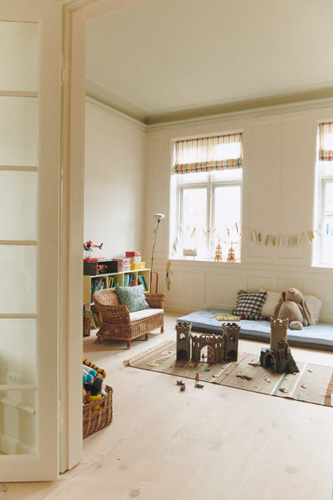 The playroom with its wonderfully high ceilings and large windows. In here, old is beautifully mixed with new, creating a modern yet classic vibe.
