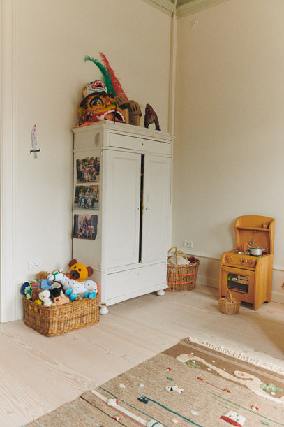 Baskets placed around the room help keep toys and teddies organized, and make tidying up easy once playtime is over. A cabinet from Carl's mother's childhood home stores Carl's clothes, while a wooden kitchen invites hours of play. Find a similar one here.