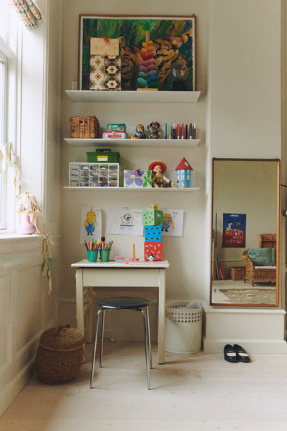 White shelves from E15 have been hung above the desk and help keep toys, crayons, a Moomin memory game and other small items organized.