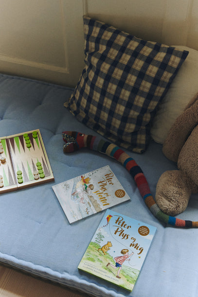 Winnie the Pooh books, a game of backgammon and a knitted snake on the mattresses.