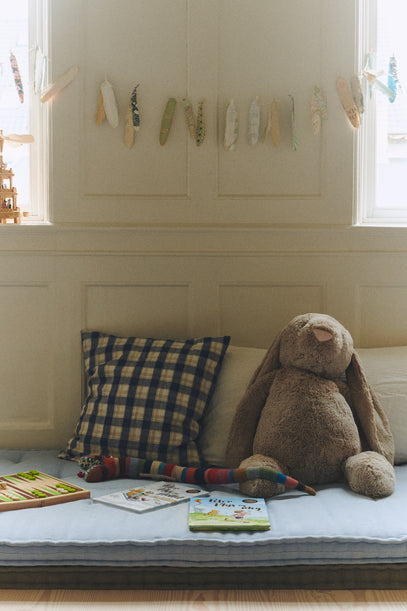 Soft pillows on top of two mattresses make for a cosy place to read, play a game of backgammon, or cuddle with the large bunny teddy.