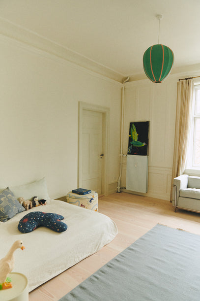 Seen here: A large wool rug in light blue adds colour, while a duck lamp is placed by the bed.