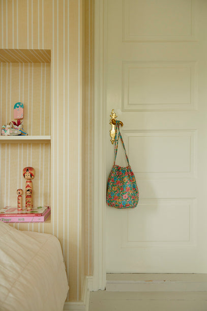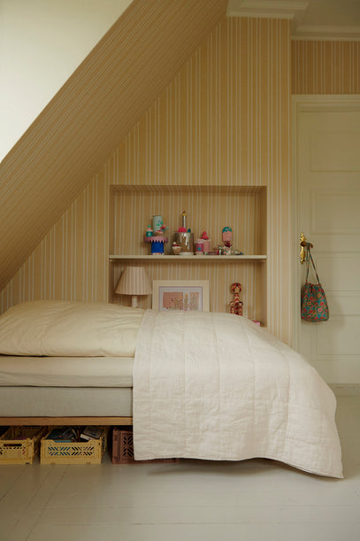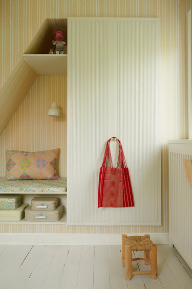 A soft pillow on the mattress, which is clad in Liberty fabric. Everything is kept in subtle but fresh colours. Eline loves to sit here in the nook.