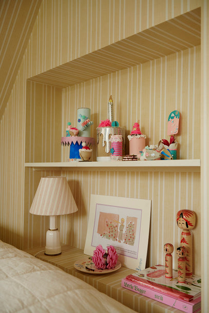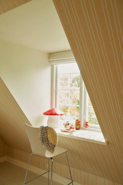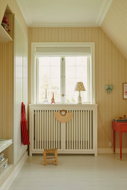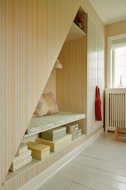The striped wallpaper from Tapet Café matches the cream doors and brass handle beautifully.