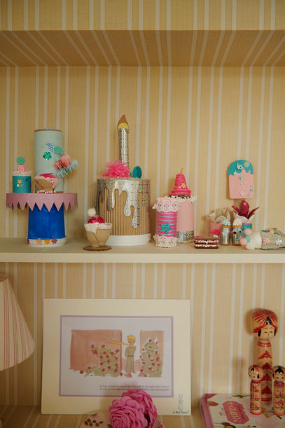 Some of Eline's homemade creations are on display on the top shelf. Here is a cake collection made from the Cake Box from Creativ Company. Eline's handmade collection is ever-changing, as new objects are added quite often and other creations are given away as presents.