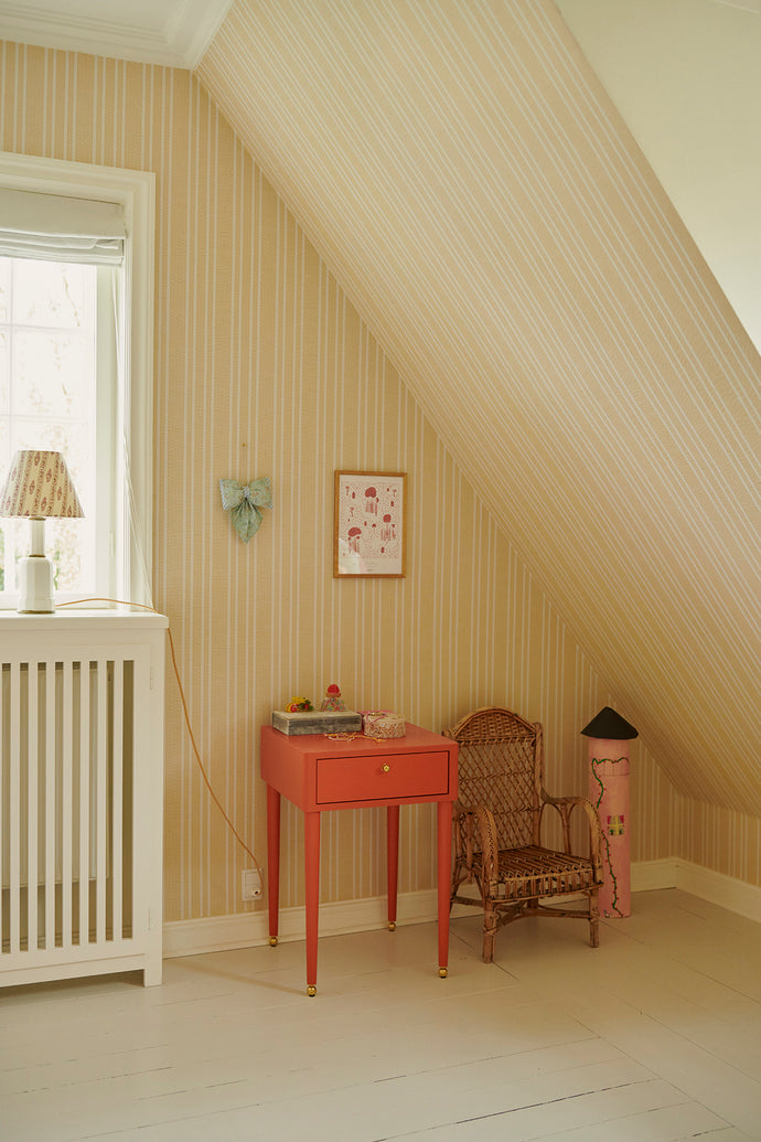 A little corner in Eline's room with a few great finds: The red side table is from Tapet Café, and the rattan chair, designed by R. Wengler, was a lucky find at a flea market.