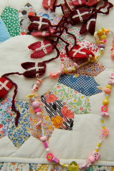 A large Mushroom Lamp adds a pop of colour, and little dolls add charm. On the chair hangs a crocheted bucket hat from Creativ Company.