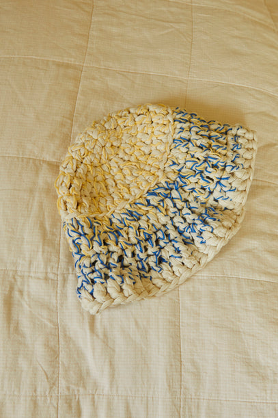 Eline is learning to crochet, and is currently working on a bag that she wants to bring to Italy this summer. On the bed lies a crocheted bucket hat, made by following the recipe in the 'Crochet Box' from Creativ Company.