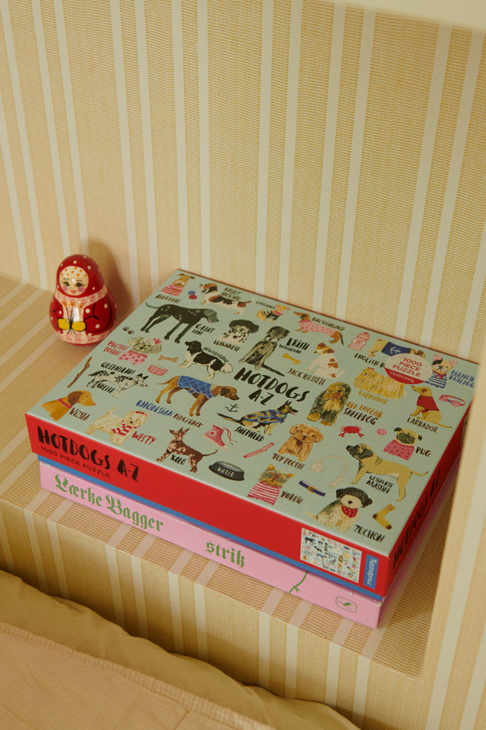 Little vintage dolls are placed all over the room. Here, one is placed on the shelf by Eline's bed next to the Hot Dog Puzzle, and the book "Strik" by Lærke Bagger – a book on knitting.