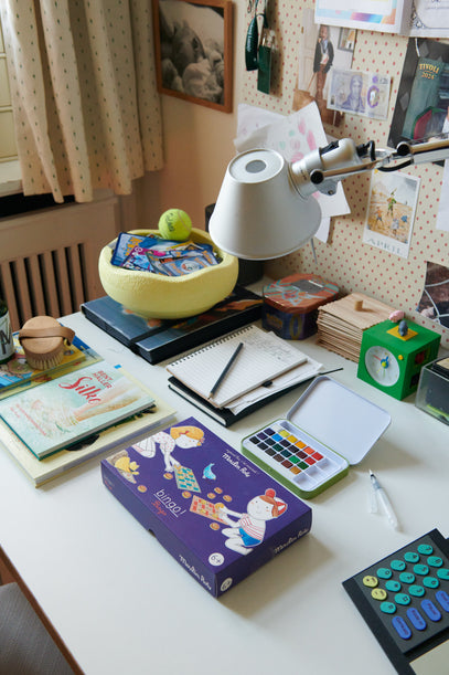 Seen here: A pastel-yellow Stapelstein (from a full set) / a game of bingo / watercolours & brush set / April postcard.