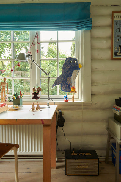 Gilbert's room is a corner room with plenty of natural light and views to the garden. The white wooden logs make the colours in here pop, but somehow the look is still surprisingly calm, and the space has a cosy, Scandinavian feel.