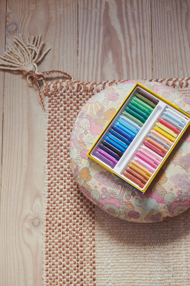Olga has added her own touch to the red drawer by decorating it with stickers. On top of the drawer is a knitted Cactus by Creme de la Crema ala Edgar, a treasure box, one more unicorn and a Liberty pouch.