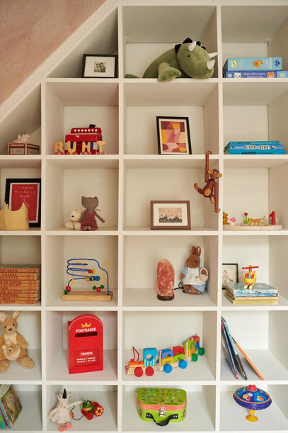 Ruth's toys, puzzles, stuffed animals and plenty of books are stored on the shelving behind the canopy. Also seen here: A Celebration Ring with little decorative figures.