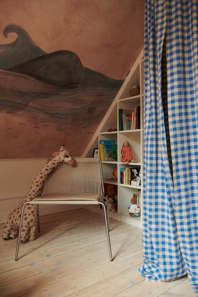 The entire back wall is covered with wonderful wallpaper from Belarte Studio, which adds warmth and depth to the room.