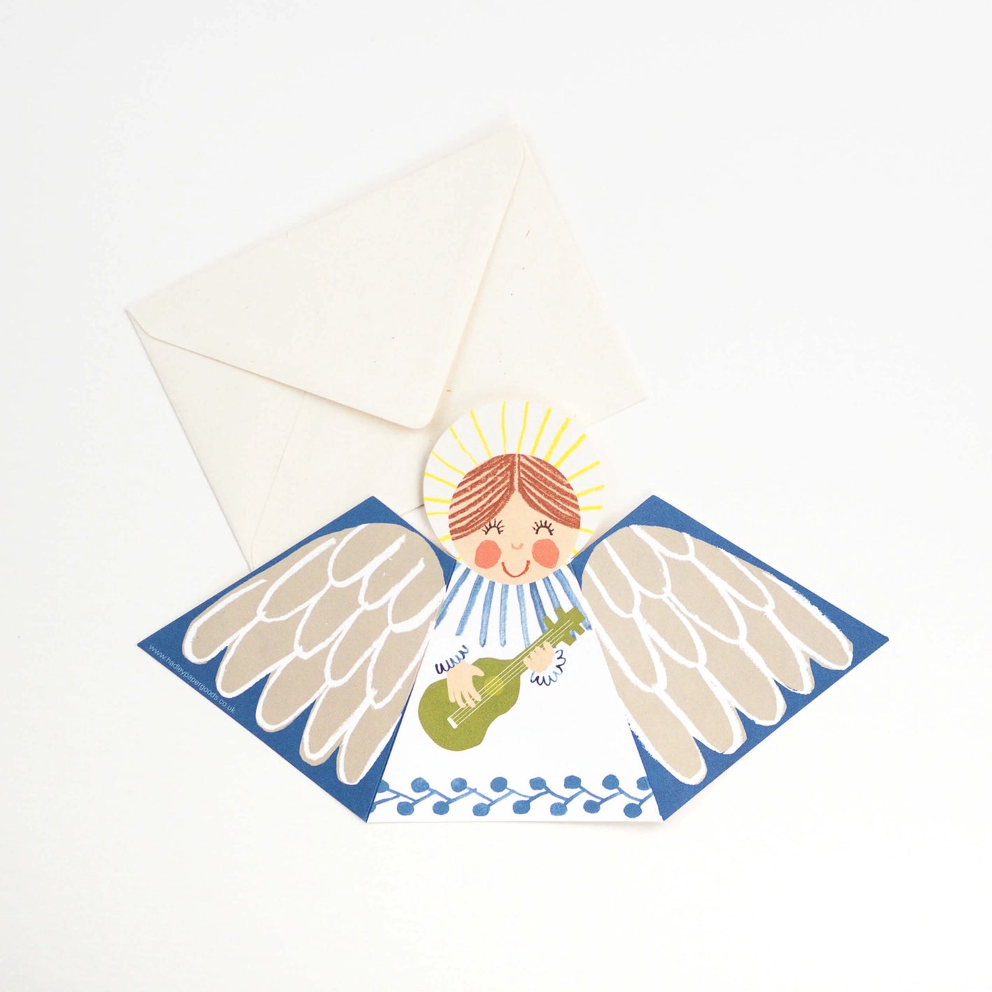 Wish someone you love a merry Christmas with this lovely fold-out card – or fold it and use as Christmas decor in your own home: This is a sweet choir angel card iwith fold-out wings so it stands beautifully on display.