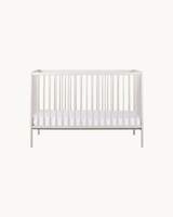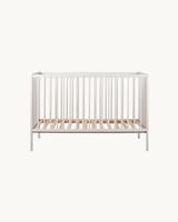 A beautiful baby crib made from solid beech in the colour clay, which has a light grey look. This crib features an adjustable height bottom with three positions (30 cm, 45 cm, and 60 cm), allowing you to customize it to the needs of your growing child.