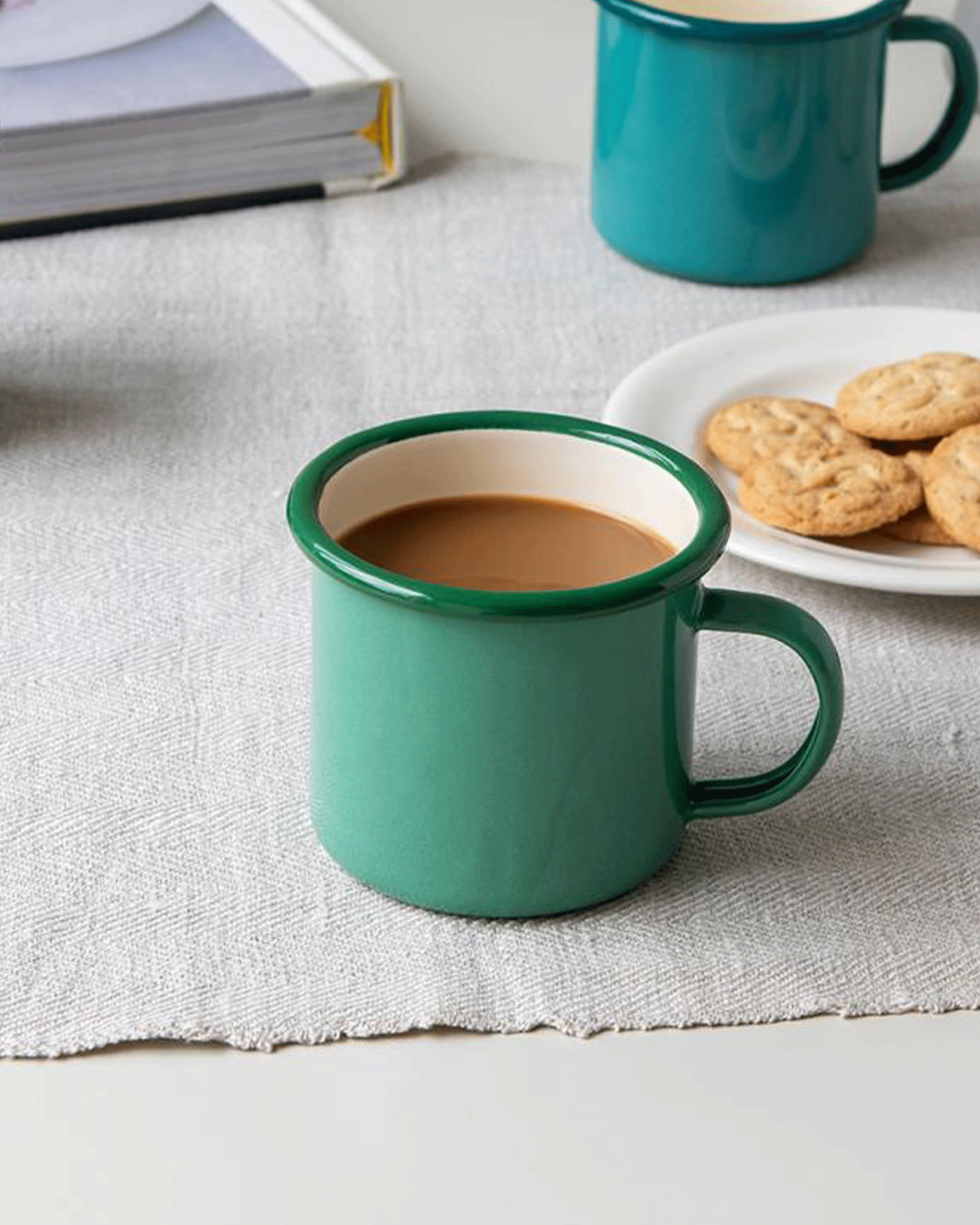 A cute little enamel cup with a handle. Perfect for hot chocolate in the forest or hot tea in the garden at home.