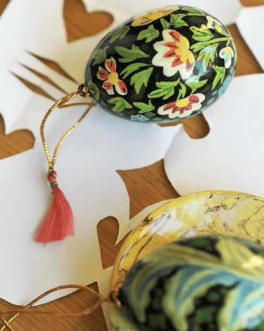 Beautiful hand painted easter eggs with strings to hang on a branch.