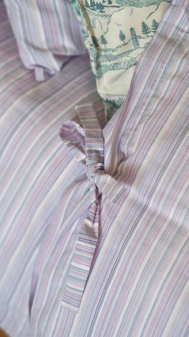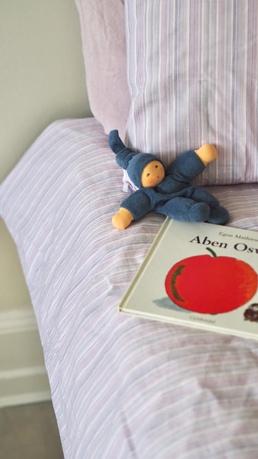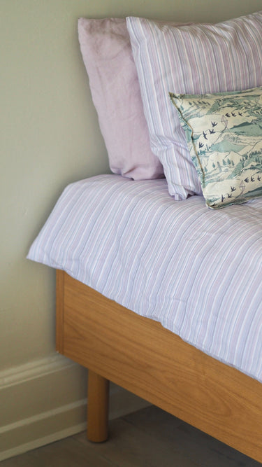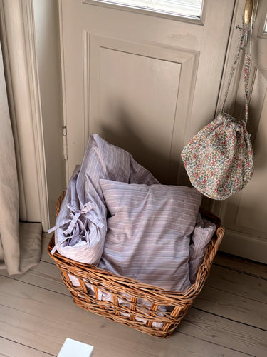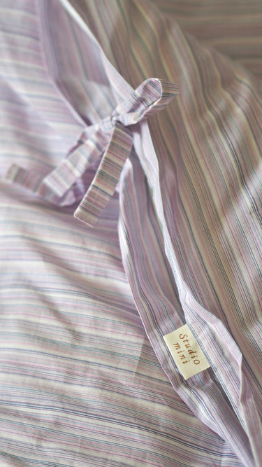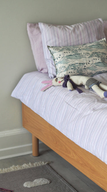Soft cotton junior bedding set, made in a beautiful striped deadstock fabric. This set includes a duvet cover with a matching pillow cover.