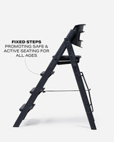 The ladder allows your child to climb up and down the chair on his/her own. At the same time, your child gets an ergonomic and comfortable posture from being able to sit by themselves (with safety rail at about 6-8 months of age) and up to the age of 6-8 years. The legs rest naturally at the different steps as they grow.