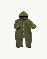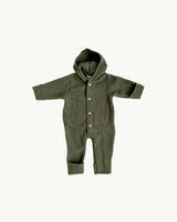 A classic baby suit that comes with a hoodie, rounded neck, classic fit and long sleeves. It comes with wooden buttons that go down the front.