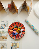 Cardboard tube showing colourful illustrations when looking through the magnifying glass at its end.