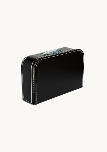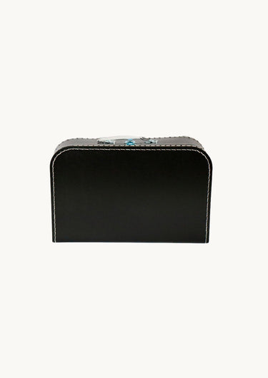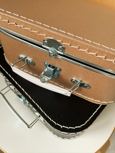 This cardboard suitcase come with cream coloured thread overstitching, and with a metal lining protecting the edges.