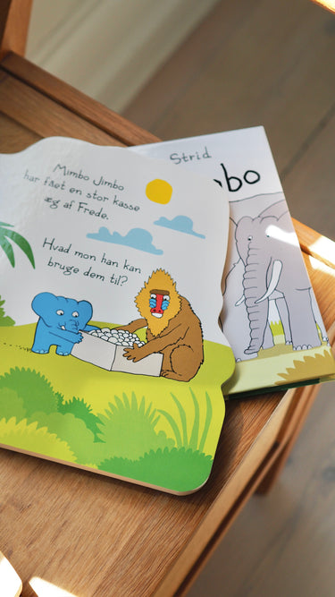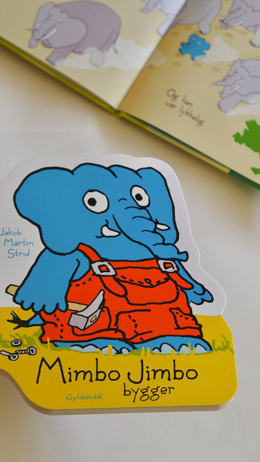A hardboard book in the shape of Mimbo Jimbo. Follow Mimbo Jimbo as he builds all sorts of fun things—a race car, an airplane, a fried egg machine, and even a lighthouse. Luckily, his friends are there to help him along the way.