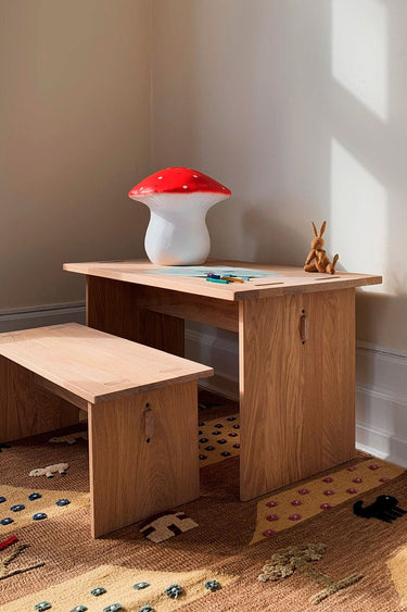 The table is produced in Europe and made from 100% solid oak. It may be used just as is, paired with any other kid's chair for a contrasting look – or pair it with the Arca Bench for a Scandinavian look in solid, natural wood.
