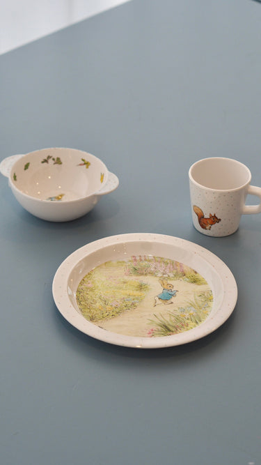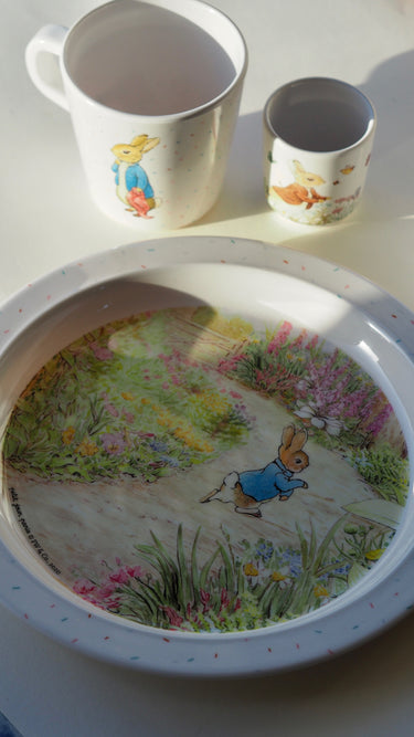 A beautiful melamine plate that is beautifully decorated with illustrations of Peter the Rabbit.