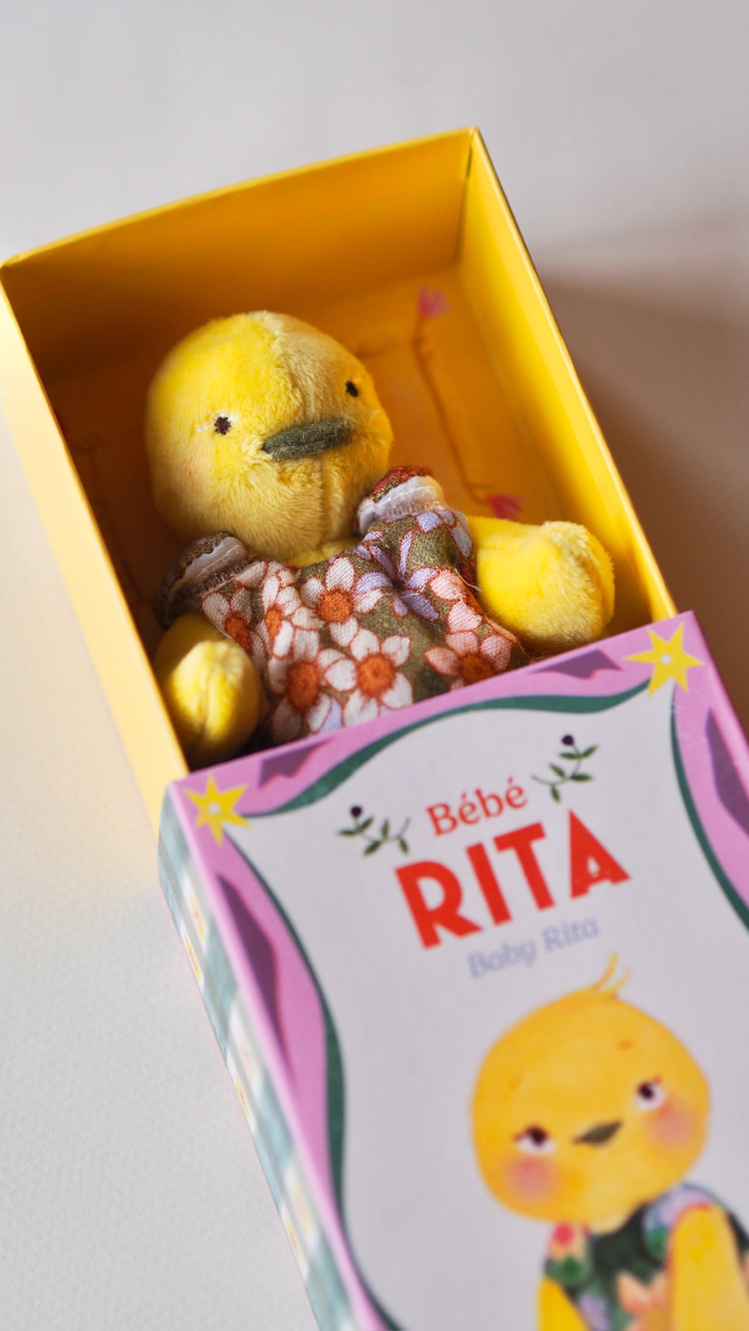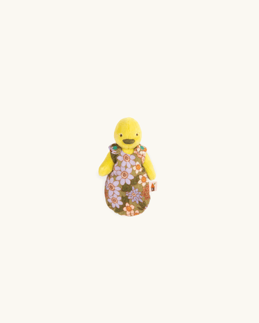 The duck comes in a box designed like a vintage matchbox that can be opened and closed. The duck can be tucked in its small sleeping bag at nighttime or when it's time for a nap.