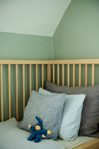 På fineste vis binder både nye og gamle ting, samt ting fra genbrug, der er nænsomt sat i stand, det hele sammen. Farverne er holdt rolige i blå, grå og grønne toner og resultatet er et roligt og rart værelse, hvor Harald kan gøre lige det en 2-årig skal: Sove, lege, udforske og vokse.