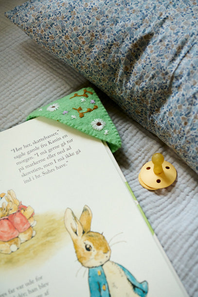 Detaljer fra sengen: Bogen Fortællingen om Peter Kanin med et bogmærke fra Gamcha og en BIBS sut i farven 'pale butter'.