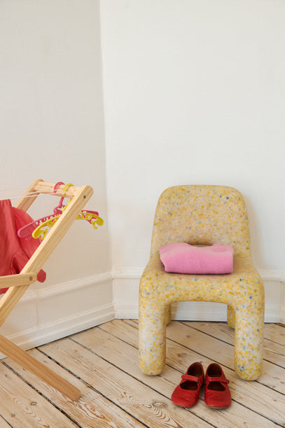 En vanilla Charlie Chair står i et hjørne ved siden af et lille tørrestativ med fine bøjler på. På stolen ligger en lyserød cashmere sweater.
