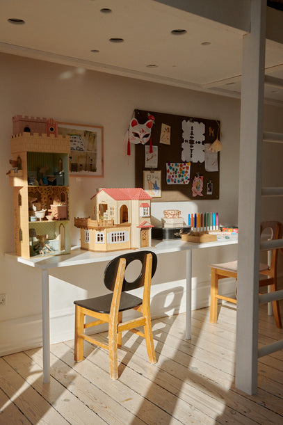 Bordet under højsengen er bredt nok til at begge piger kan sidde samtidigt, og sammen – eller hver for sig – fordybe sig i en tegning, et dukkehus, et puslespil eller andet. Her er en hyggelig og næsten lidt hulestemning under køjen.
