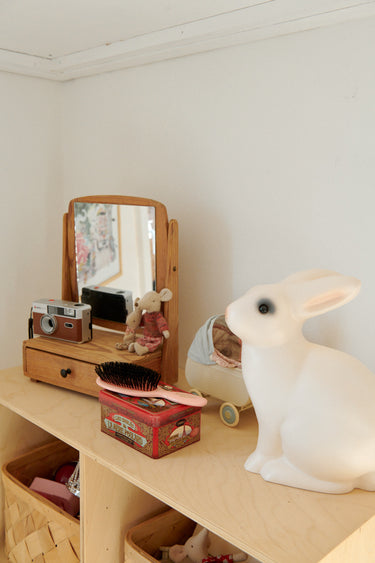 Spil, legetøj, udklædning og andre gode sager bliver opbevaret i åbne kurve inde i reolen, bl.a. i den lyserøde kurv fra Rice. Øverst på reolen står en kaninlampe og her ligger også en lyserød børste fra Mason Pearson.