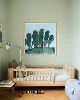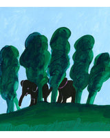 'Elefanterne Gemmer Sig' kommer fra Thomas Windings bog "Hvor er Elefanterne?" Plakaten har fine farver af blå, grøn og et strejf af pink og passer smukt ind på de fleste baby- og børneværelser.