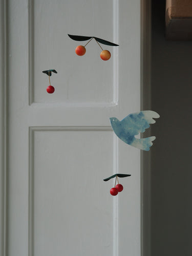 En rolig og smuk uro med fem farverige kirsebær og en fugl, der jagter smagen af den røde frugt.
