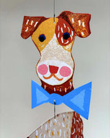 En håndlavet og fin cirkus hund uro, der hænger roligt og bevæger sig stille, som luft kommer ind i værelset.