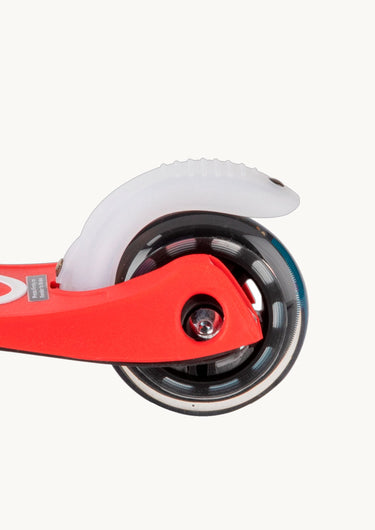 Et flot rødt løbehjul, med hjul der lyser op i farver når de drejer rundt.