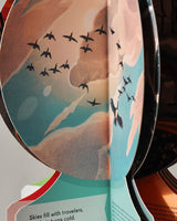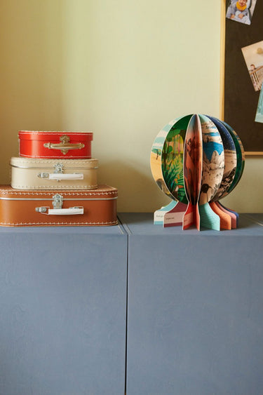 Bogen kan åbnes, foldes og stilles, og skaber på den måde en fritstående globus.