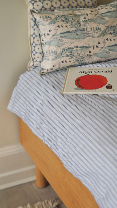A soft, organic cotton junior bedding set, made in a beautiful striped deadstock fabric. This set includes a duvet cover with a matching pillow cover.