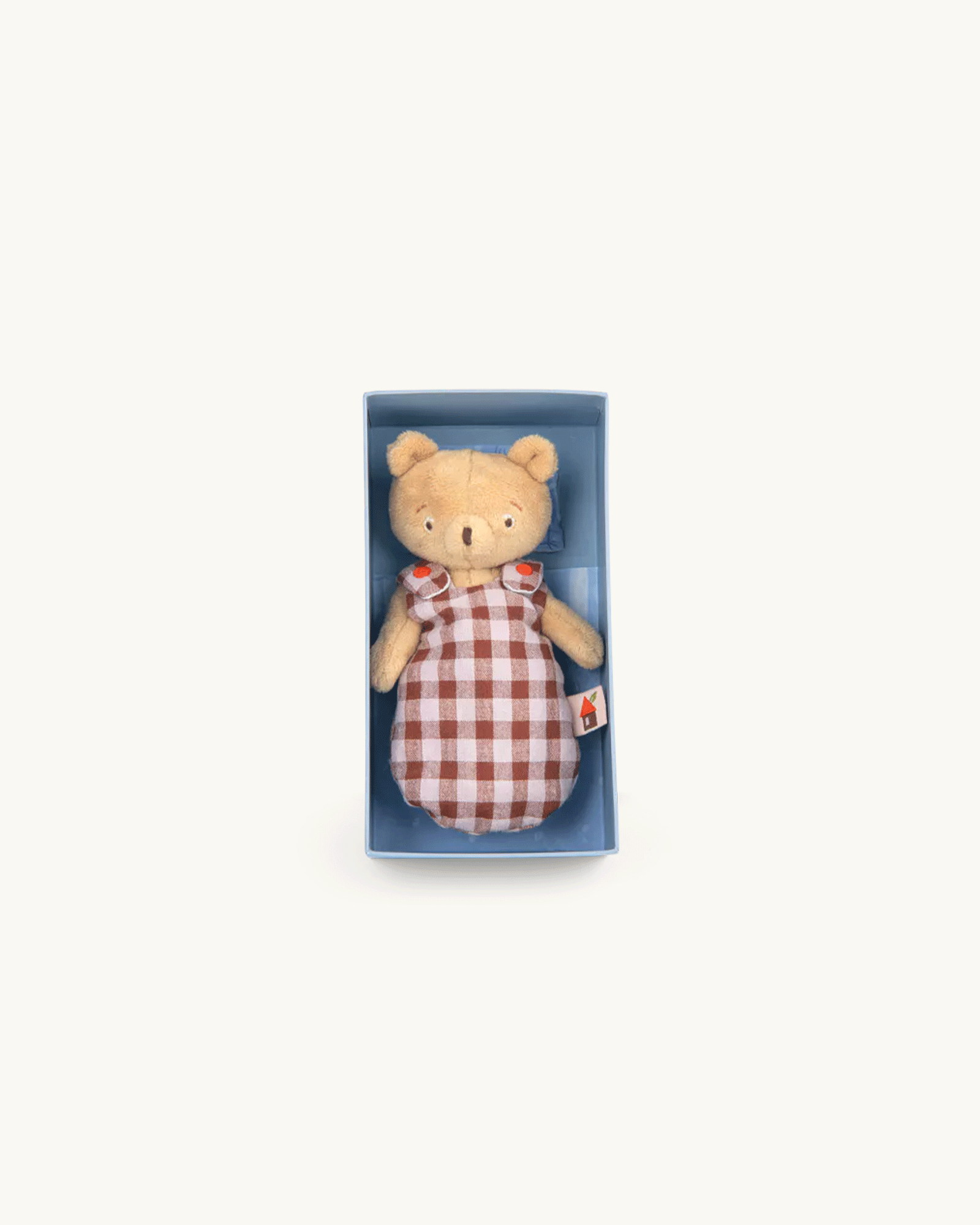 The bear comes in a box designed like a vintage matchbox that can be opened and closed. The bear can be tucked in the small sleeping bag at nighttime or when it's time for a nap.