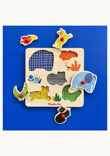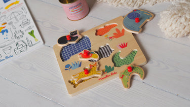 A lovely wooden puzzle with 5 large pieces with fun and colourful illustrations, that help your baby understand shapes and colours.