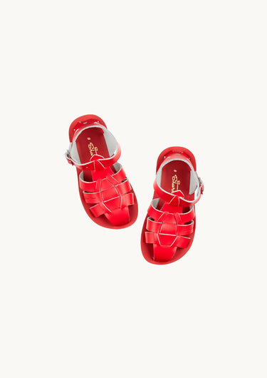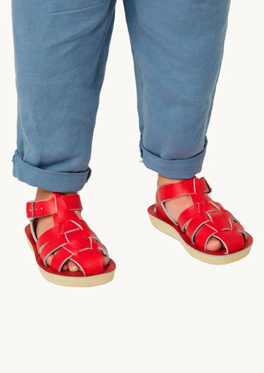 The perfect summer sandal for little explorers. This is Shark, a closed toe sandal for babies, here in a red colour.