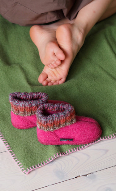 The Wool Shoe is a wonderful indoor shoe that comes with a sock-like top, that keeps your child warm and comfortable. The "sock" ensures that the shoe stays on the foot, but it is fully bendable and flexible and with no hard edges that may rub into the lower ankle as your child bends or sits downs.