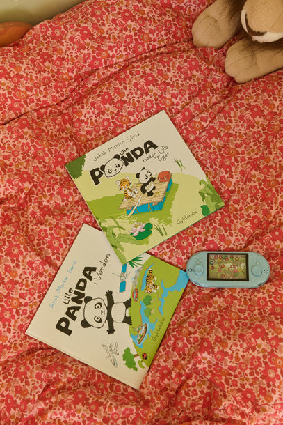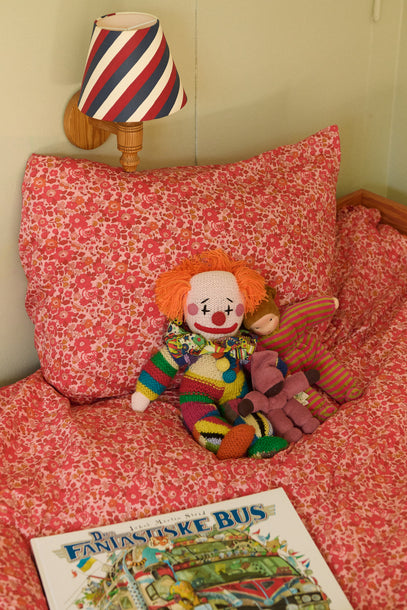 Den Fantastiske Bus, another Jakob Martin Strid classic, lies on the bed next to a knitted clown and a small Pimpel doll in colour berry.