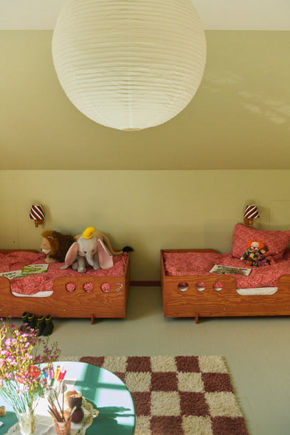 The layout is wonderfully simple: Both beds line one wall, freeing up the middle of the room for what matters most at this age: Play, focus and creativity. Books, toys and fun games fill the shelves, and are stored in baskets and on shelves so that they are easily within reach.