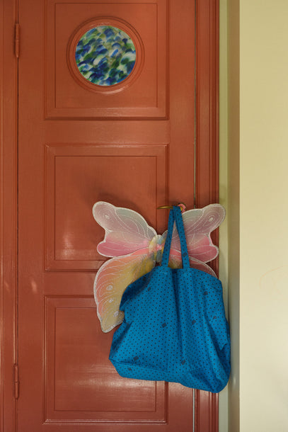 The round glass in the door has been designed by Annika, and custom made to fit the door. On the handle hangs butterfly wings and a large blue tote from Bonton.